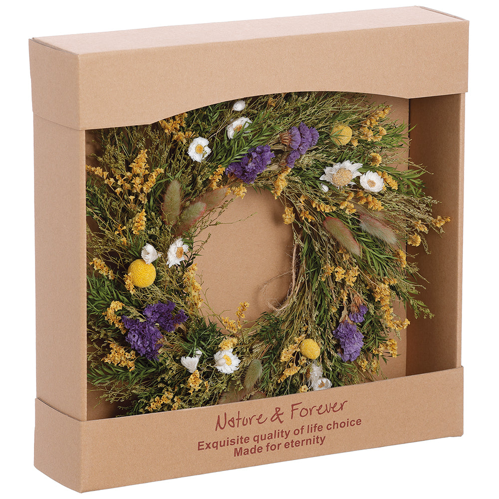 13.5" Preserved Statice, Yarrow & Kitten Tail Flowering Wreath -Yellow/Purple-Artificial plants/flowers
