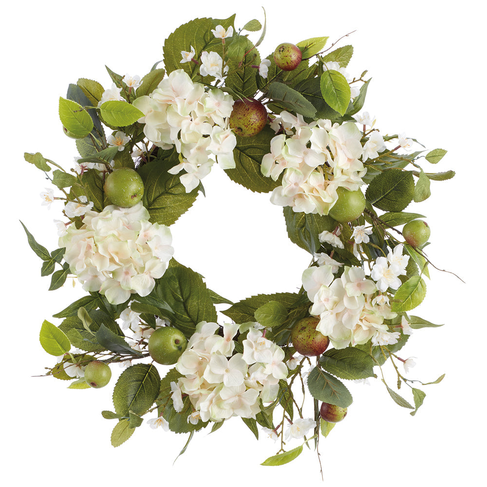 24" Hydrangea, Blossom & Apple Silk Flower Wreath -White/Green-Artificial plants/flowers