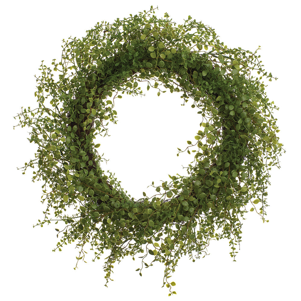Stunningly beautiful, this 24" PE Soft-Touch Muehlenbeckia Wire Artificial Wreath in Green is the perfect greenery wreaths and luscious that they mirror a mini garden. The only difference is you have the option of hanging it up, and you don't have to water it at all. This faux wreath has been exquisitely crafted with special attention to detail and with the finest quality materials so that it'll bring a gorgeous warmth that is realistic and everlasting. This wreath captures the essence of summer and spring and will invigorate your home's aesthetic in the most inviting way imaginable.