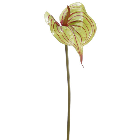 Stunningly beautiful, this 25" Hand-Wrapped Silk Anthurium Flower Spray in Green/Burgundy adds a sculptural, tropical focal point with bold, heart-shaped blooms that command attention. Use this stem in modern arrangements, resort-inspired décor, spa settings or event designs, either on its own or combined with tropical foliage and other faux flowers for dramatic, contemporary looks.
