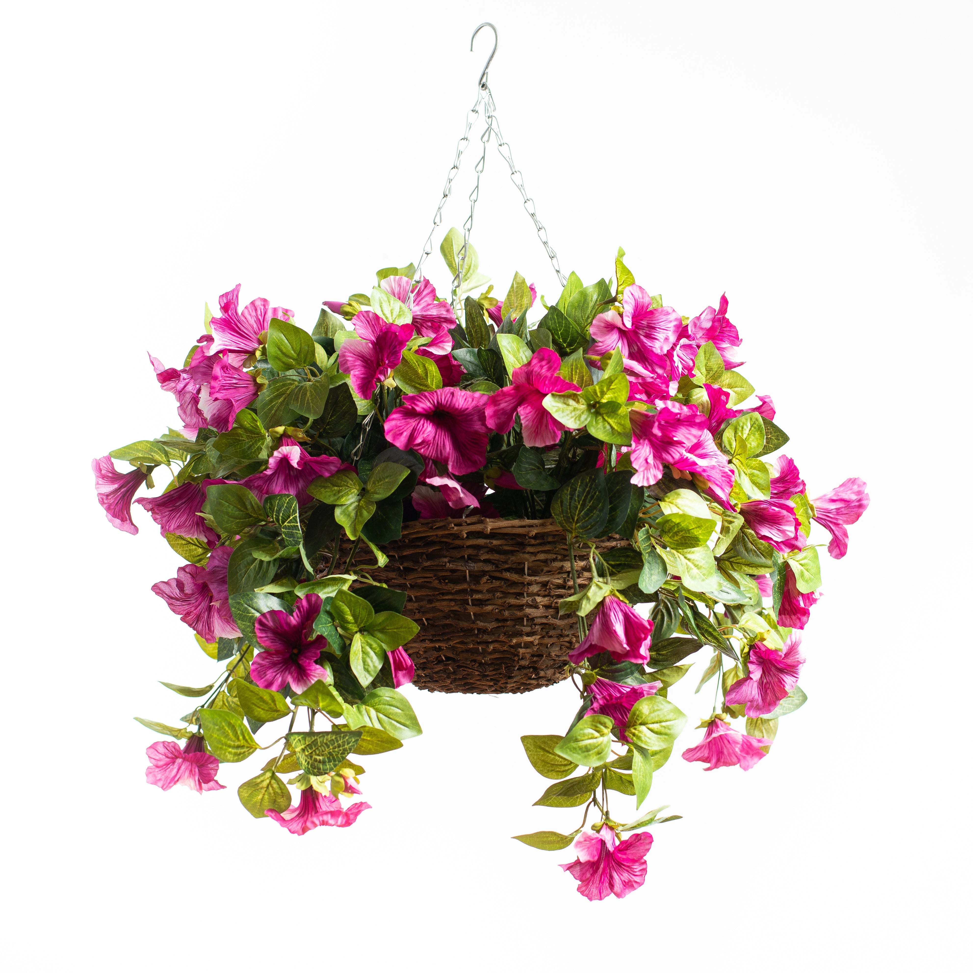 Cascading Magenta Petunia Artificial Plant in Round Rattan Hanging Basket-Artificial plants/flowers