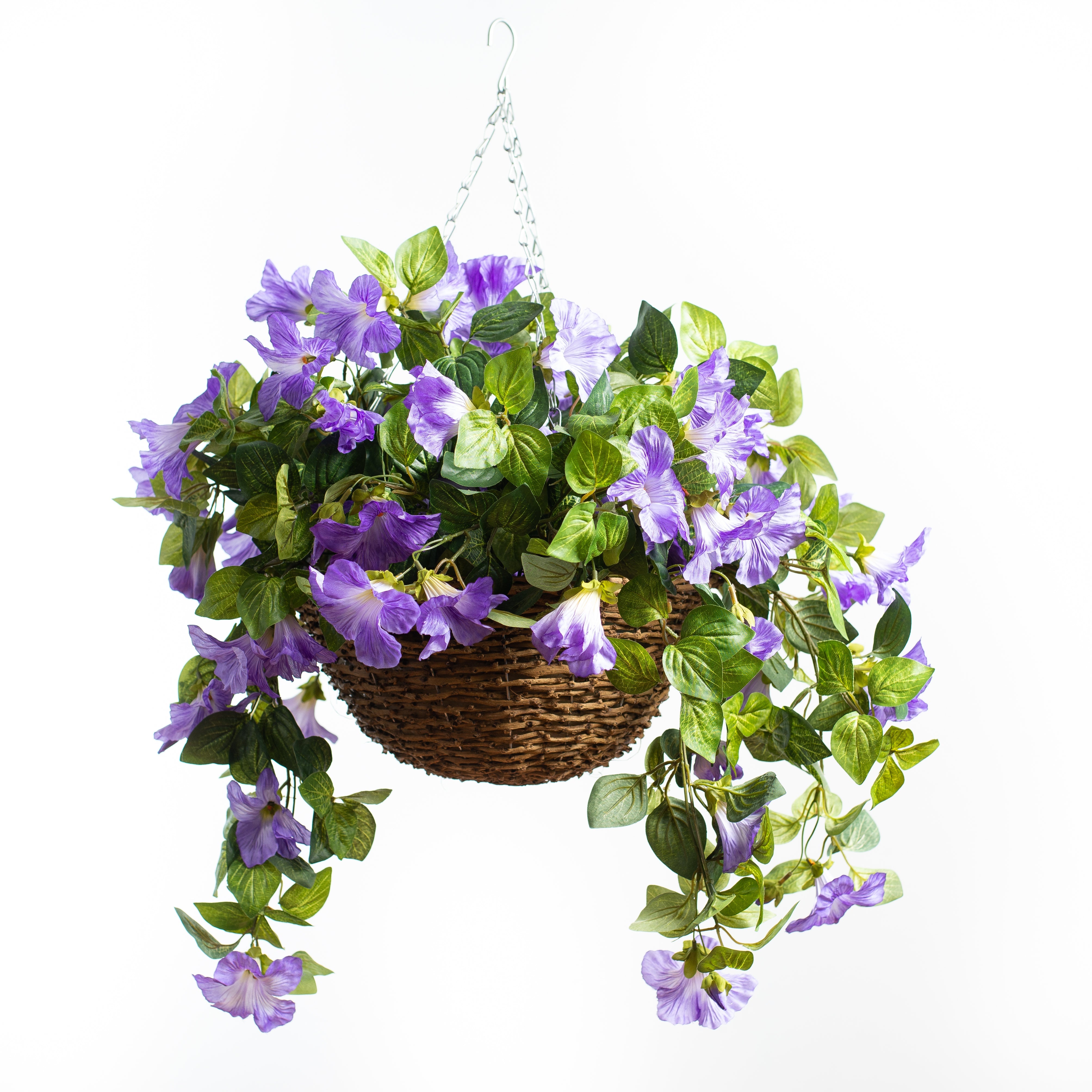 Cascading Purple Petunia Artificial Plant in Round Rattan Hanging Basket-Artificial plants/flowers
