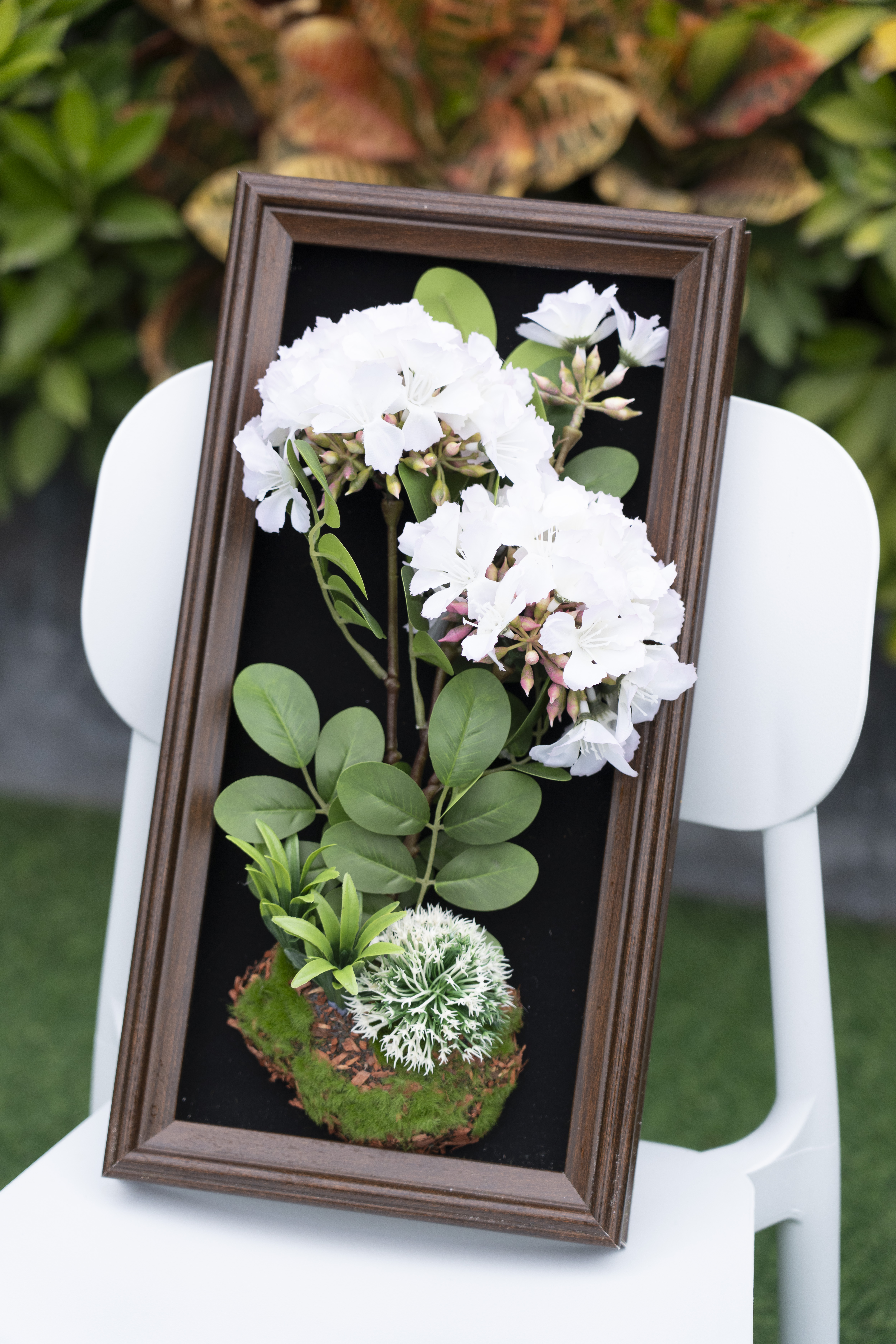 This framed flower art centers on pink-purple azaleas, replicating their clustered full bloom shape and soft pink gradient texture. Paired with glossy green leaves and fresh green foliage, it’s 3D embedded in a 23*45cm light white frame— the black background highlights the flower’s fresh and gentle charm.The full, three-dimensional blooms, with distinct layers, showcase the unique strength and sophisticated texture of this native flower. Dark petals complement the autumn-toned artificial foliage, ferns, and moss, creating a natural, serene, and artistic visual effect.