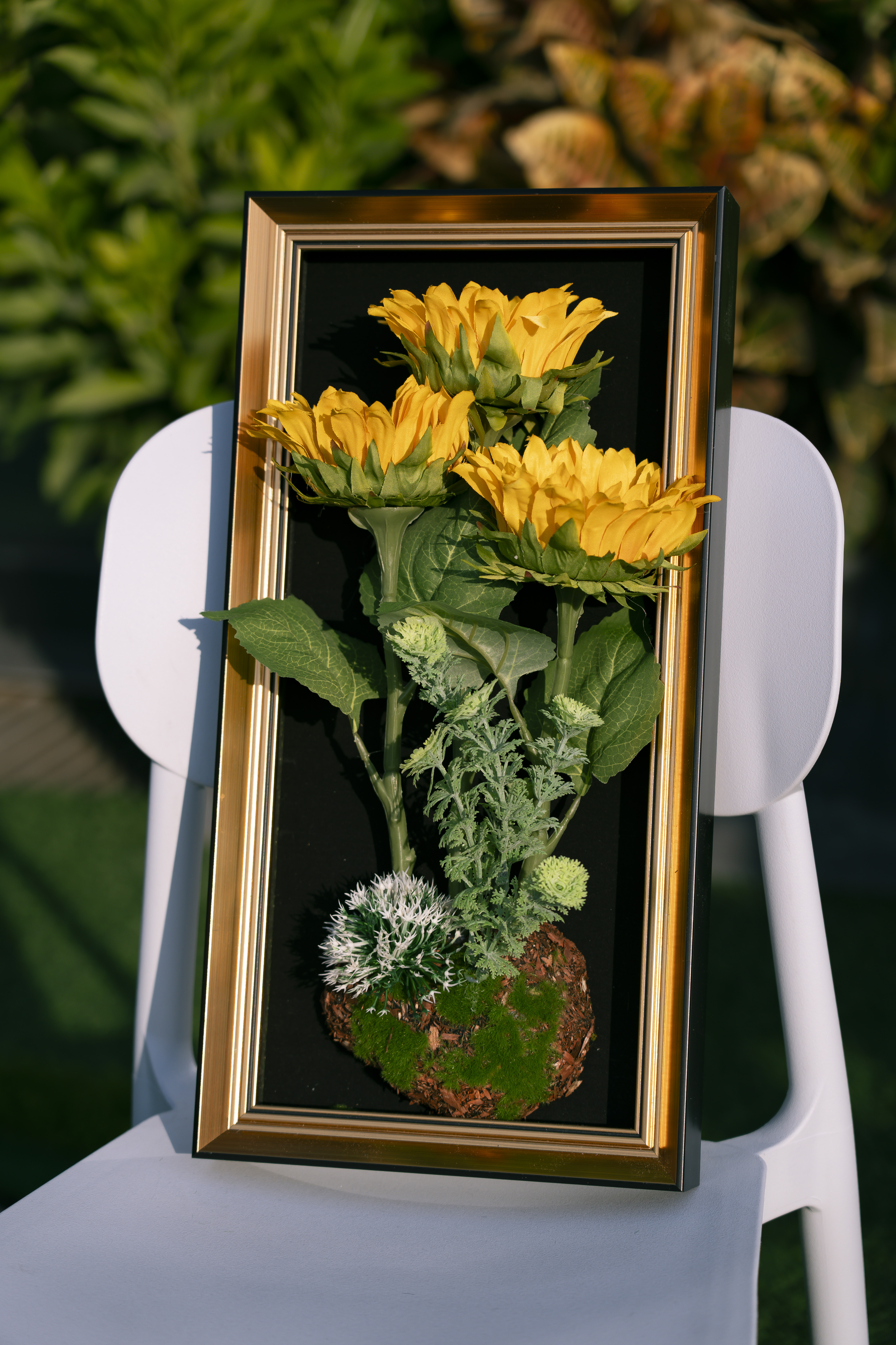 Materials: Artificial sunflower + Artificial greenery / Moss