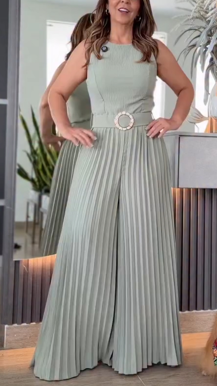 Womens Round Neck Patchwork Pleated Temperament Casual Jumpsuit